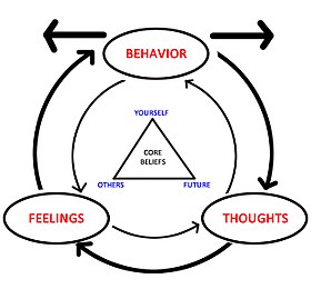 Segitiga di tengah mewakili prinsip CBT bahwa keyakinan inti semua manusia dapat diringkas dalam tiga kategori: diri, orang lain, masa depan.